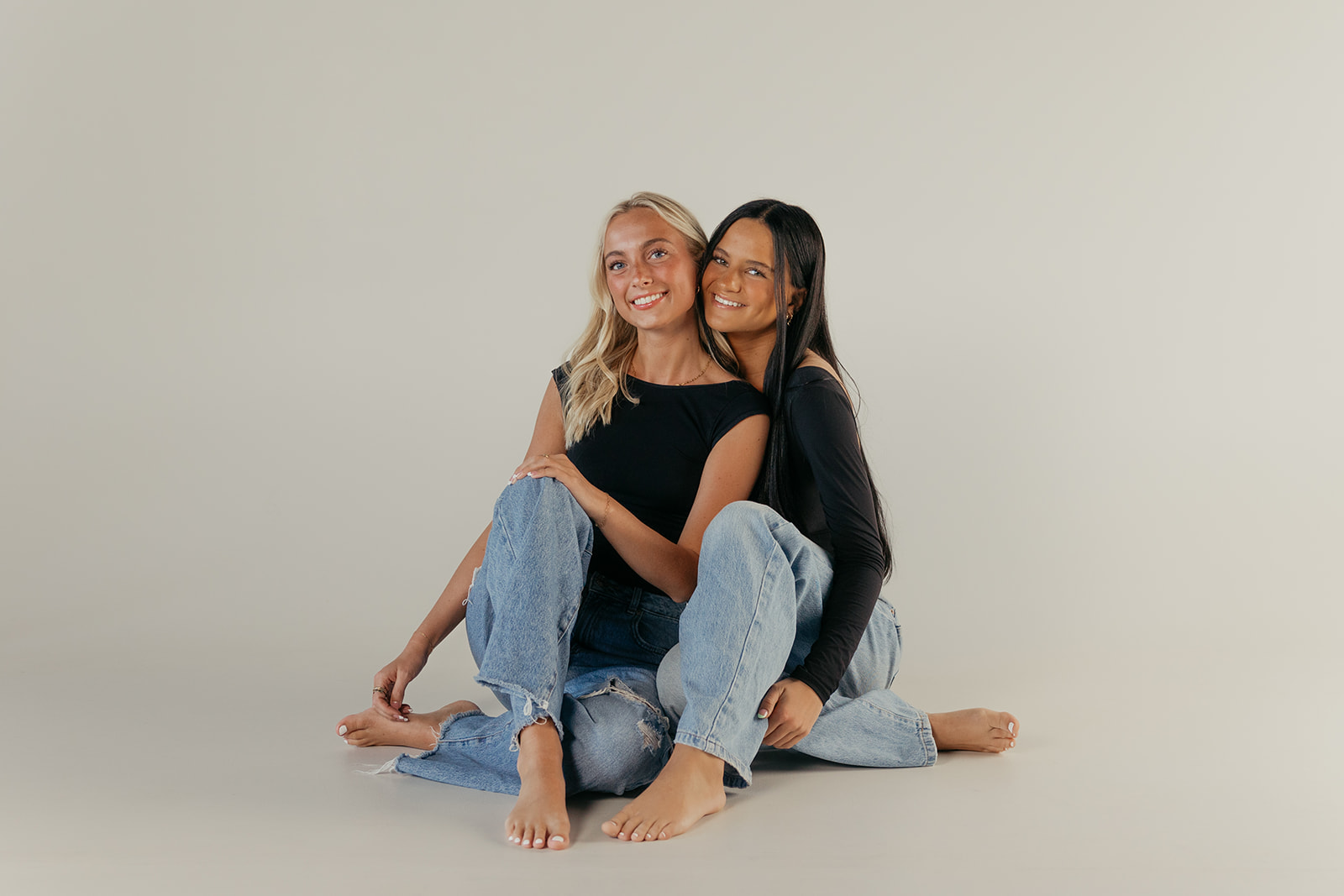 We kept the location super easy with a studio and stuck with a seamless white background for majority of the session. Lylie and Faith came ready to go in a super cute first look with wide-leg baggy jeans and simple black tops. I loved this look because it was so effortless and cool-girl coded. This simple background and outfit choice let us have a lot of fun with the two girls posing and showing off their friendship.